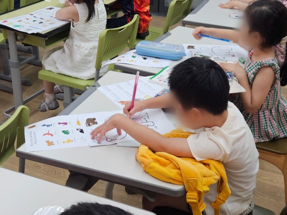 스토리 수업 후에는 동물 그림이 포함된 워크시트를 활용해 색칠하기, 따라 쓰기, 단어 연결하기 활동이 이어졌는데요. 아이들은 각자 자리에서 집중해서 연필을 잡고 활동에 참여했고, 강사님은 교실을 천천히 돌며 한 명 한 명 눈을 맞추고 짧게 피드백을 주는 모습을 보였습니다.