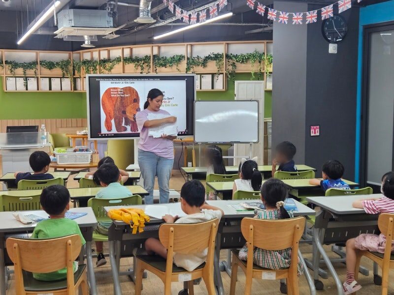 이후에는 Brown Bear, Brown Bear, What Do You See? 스토리북을 활용한 수업이 진행되었는데요. 강사님은 책 내용을 그대로 읽어주기보다, 그림을 먼저 보여주고 아이들에게 “What do you see?”를 질문한 뒤 아이들의 반응을 기다리는 방식으로 수업을 이끌었습니다.