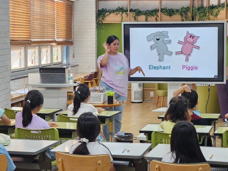 수업은 간단한 인사와 아이들이 이미 알고 있는 단어를 말해보는 활동으로 시작되었습니다. 강사님은 화면을 활용해 Elephant, Piggie 와 같은 동물 캐릭터를 보여주며 아이들이 자연스럽게 단어를 말하고 따라 할 수 있도록 유도했답니다.